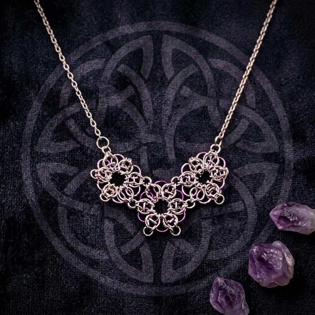 The Liminal Bloom Necklace captures the quiet magic of transition. A chainmail design inspired by Celtic floral patterns, brought to life in layered shades of purple. Each interwoven ring forms a blooming structure that feels both grounded and unfolding, like a threshold you can wear.